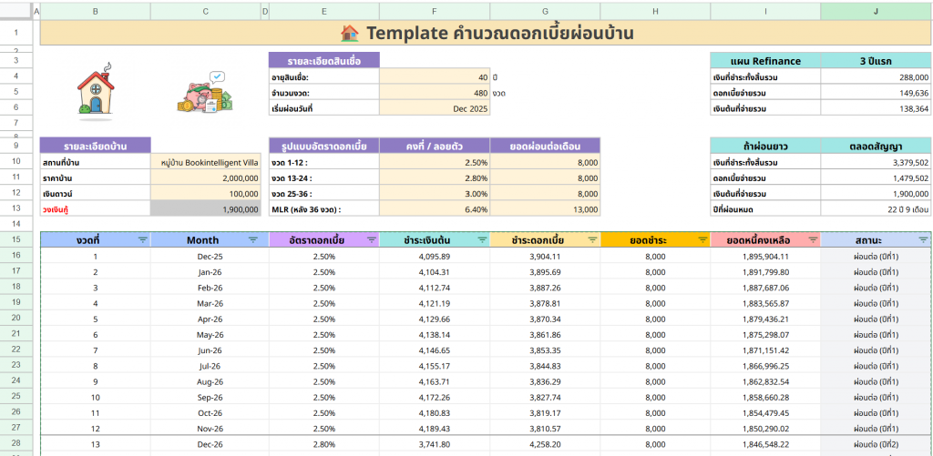 การผ่อนบ้านไม่ใช่แค่การจ่ายเงินรายเดือนเท่านั้น แต่คือการวางแผนทางการเงินในระยะยาวอย่างชาญฉลาด Template คำนวณดอกเบี้ยบ้านนี้ออกแบบมาเพื่อช่วยให้คุณเห็นภาพรวมทั้งดอกเบี้ย เงินต้น และวางแผน Refinance หรือ Retention ได้อย่างคุ้มค่า