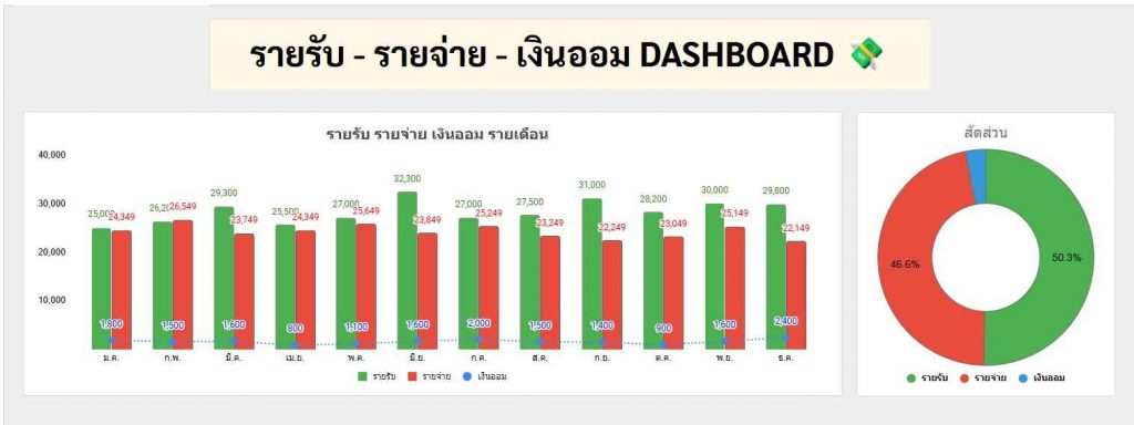 แสดงกราฟรายรับ รายจ่าย และเงินออมในแต่ละเดือน พร้อมสัดส่วนการใช้เงิน เหมาะกับการวิเคราะห์แนวโน้มพฤติกรรมการใช้เงินในระยะยาว