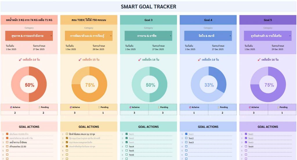 ไฟล์นี้ไม่ใช่แค่ตาราง Spread Sheet ธรรมดา แต่มันคือ Dashboard ชีวิต ที่ออกแบบโดยใช้หลักการ SMART Goal (Specific, Measurable, Achievable, Relevant, Time-bound) ผสมผสานกับการติดตามผลแบบ Real-time ครับ