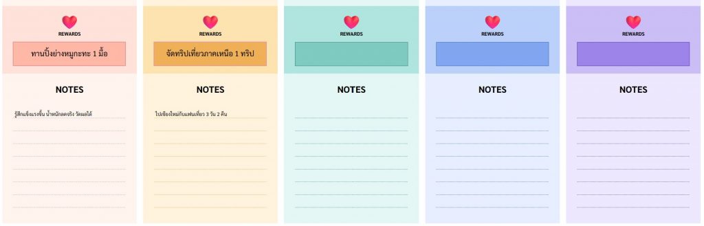 อย่าเครียดเกินไปครับ! ตั้งรางวัลไว้เลย ถ้าทำสำเร็จจะให้อะไรกับตัวเอง และมีช่อง Notes ไว้จดบันทึกความรู้สึก หรือบทเรียนระหว่างทาง