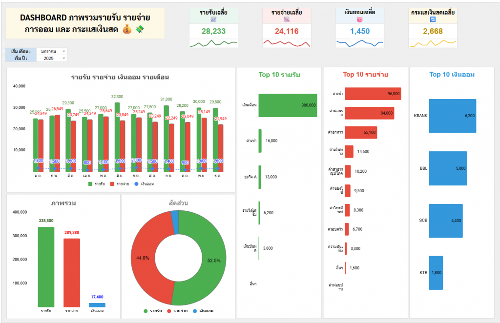 🔹 Dashboard สวยงาม สรุป รายรับ รายจ่าย เงินออม กระแสเงินสด แยกทั้งรายปี และ รายเดือน พร้อมกราฟแท่งและกราฟโดนัท สุป