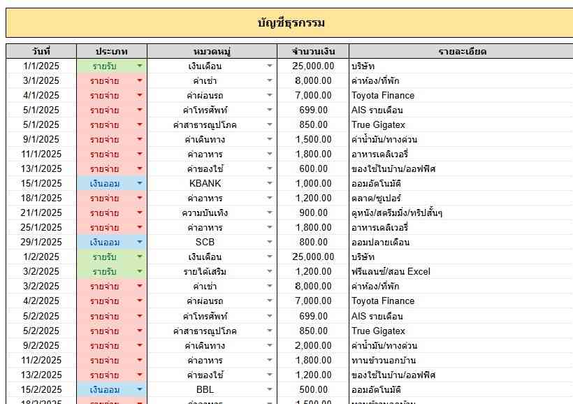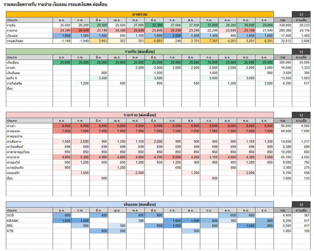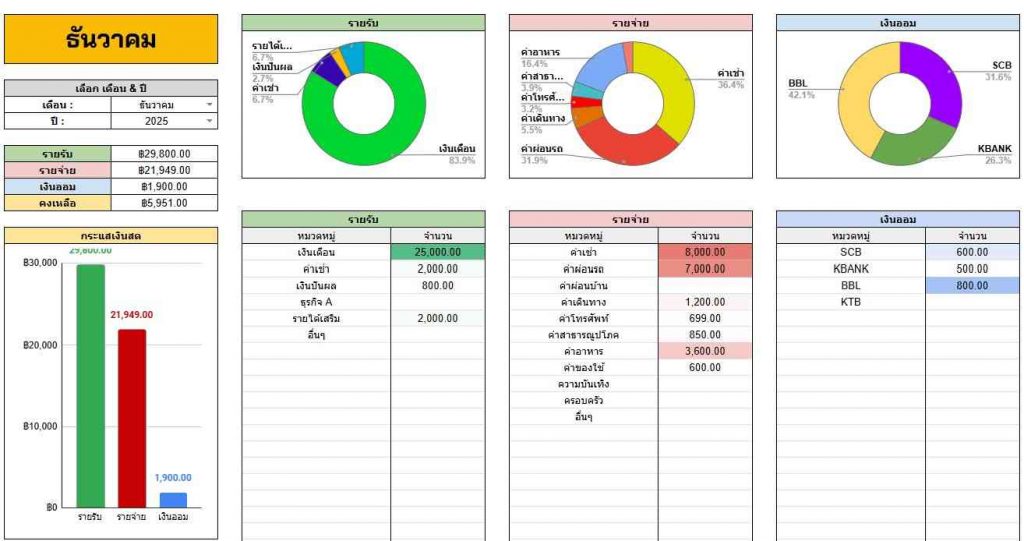 มีรายละเอียดรายรับ รายจ่าย เงินออม แบ่งเป็นประเภท และ รายเดือน พร้อมมี Highlight Heat Map เพื่อให้ดูรายละเอียดด้านในได้ง่าย (จำนวนไหนมากจะสีเข้ม – จำนวนไหนน้อยจะสีอ่อน)