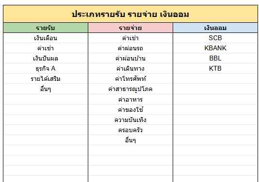 เป็นหน้าสำหรับใส่หมวดหมู่รายรับ รายจ่าย เงินออมที่เราใช้ประจำ เช่น เงินเดือน ค่าอาหาร ค่าเดินทาง ฯลฯ เพื่อให้ระบบดึงมาแสดงแบบ Drop-down และลดเวลาการกรอกข้อมูล