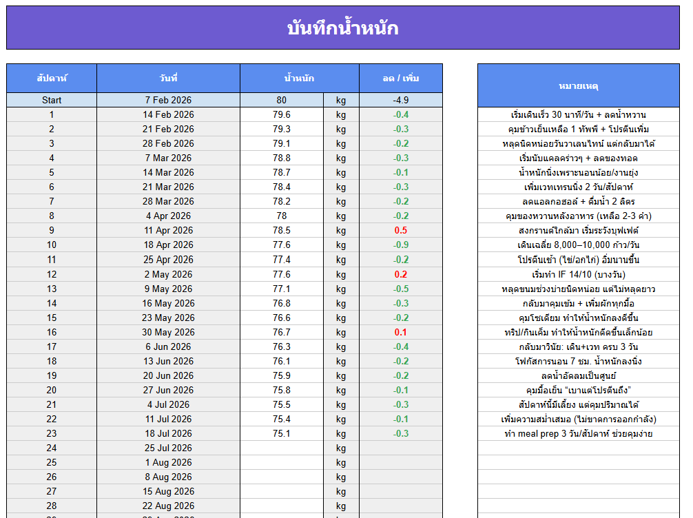 • เป้าหมายต่อสัปดาห์: เช่น ลด 0.2–0.5 กก./สัปดาห์